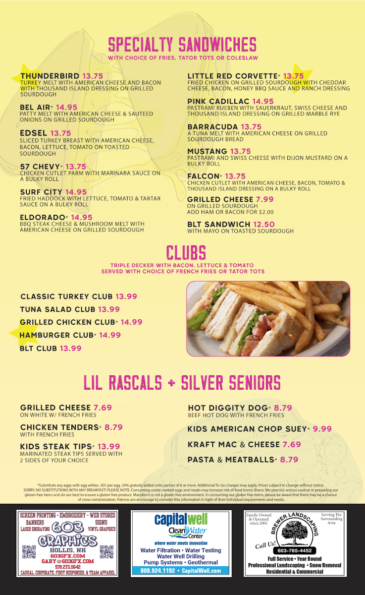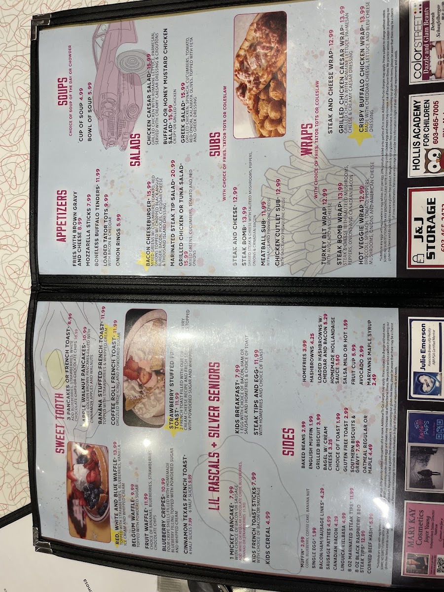 For breakfast or brunch, the menu includes several omelets such as the Kitchen Sink Omelet and Meat Lovers Omelet, alongside other breakfast staples like steak tips and eggs. The Lil Rascals + Silver Seniors section is tailored towards smaller appetites or younger diners, offering meals such as hot dogs, grilled cheese sandwiches, chicken tenders, kids' steak tips, and macaroni & cheese, often served with sides like french fries or garlic bread.