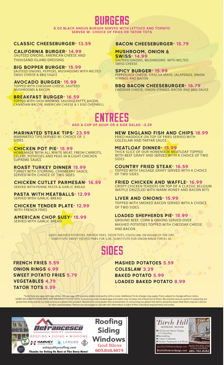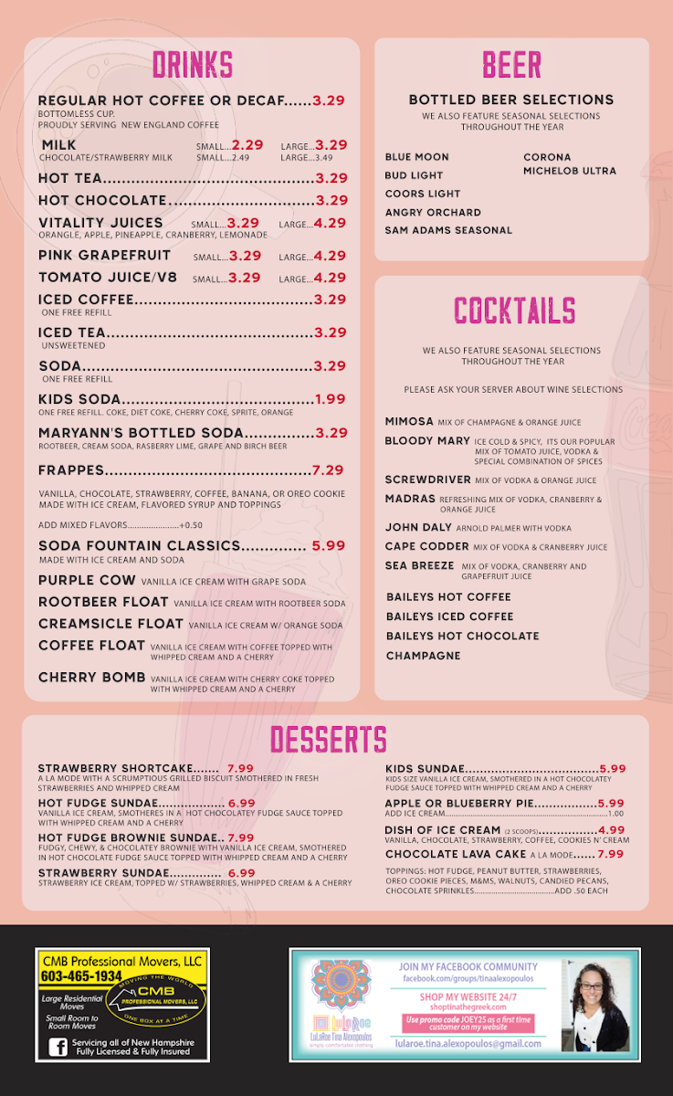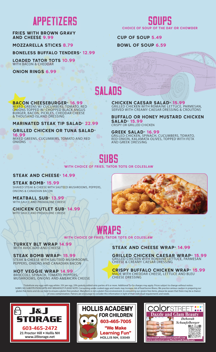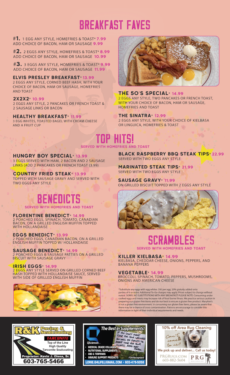 The menu at Mary Ann's Diner offers a variety of classic diner fare structured into several distinct categories to suit different meal times and preferences. Guests can choose from a selection of subs featuring options like Chicken Cutlet, Meatball, and Steak & Cheese, each served with sauces and cheeses. The burger section includes a range of choices such as the Avocado Burger, Bacon Cheeseburger, and BBQ Bacon Cheeseburger, with toppings that include cheddar, sautéed mushrooms, bacon, and barbecue sauce.